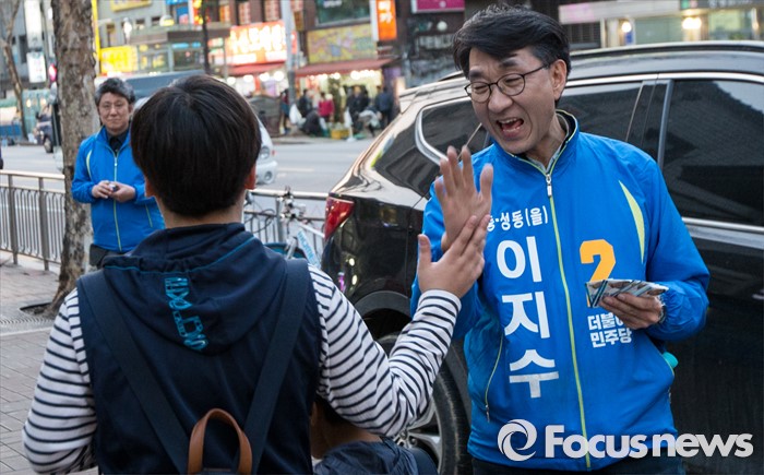 (서울=포커스뉴스) 5일 오후 서울 중구 신당역 인근에서 선거유세에 나선 이지수 더불어민주당 중구성동구을 후보가 한 학생과 하이파이브를 하고 있다.