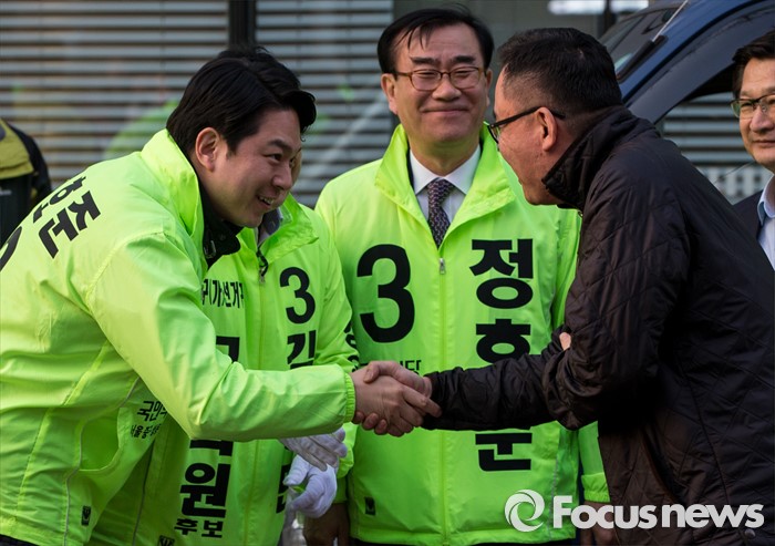 (서울=포커스뉴스) 5일 오후 서울 중구 충정로역 인근에서 선거유세에 나선 정호준 국민의당 중구성동구을 후보가 유권자들과 악수하고 있다.