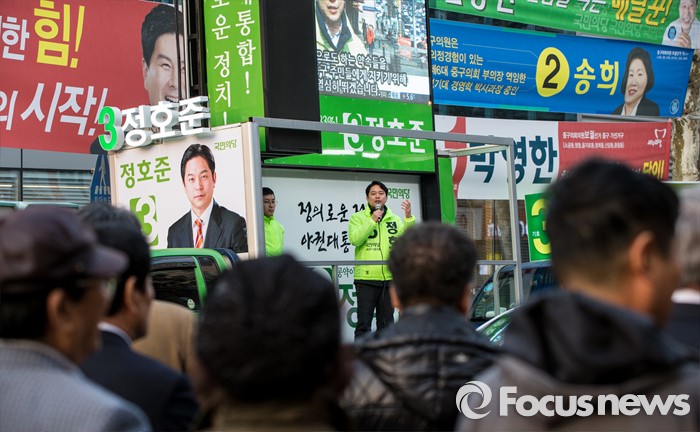 (서울=포커스뉴스) 5일 오후 서울 중구 충정로역 인근에서 선거유세에 나선 정호준 국민의당 중구성동구을 후보가 유권자들의 지지를 호소하고 있다.