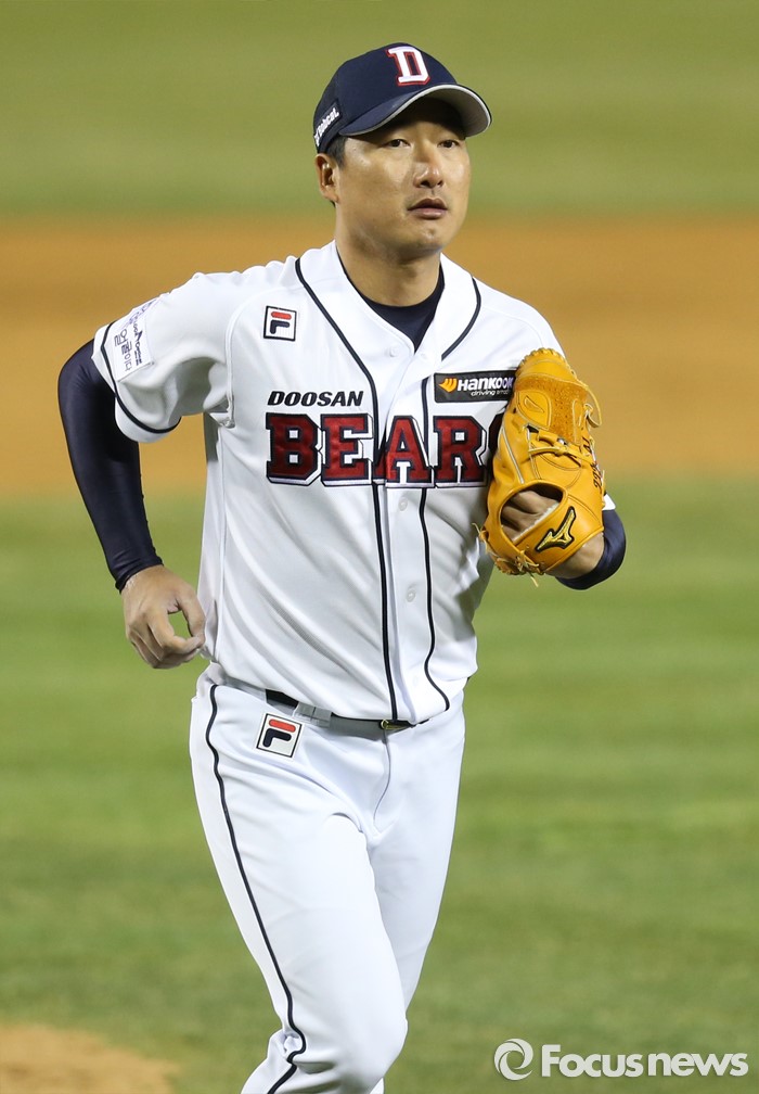 (서울=포커스뉴스) 5일 서울 잠실구장에서 열린 2016프로야구 NC-두산 경기에서 7회 등판한 두산 투수 정재훈이 이닝을 마치고 덕아웃으로 들어가고 있다.