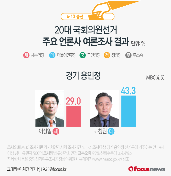 (서울=포커스뉴스) MBC가 리서치앤리서치에 의뢰해 5일 발표한 여론조사 결과에 따르면 새누리당 이상일 후보의 지지율은 29.0%, 더불어민주당 표창원 후보의 지지율은 43.3%를 기록했다.