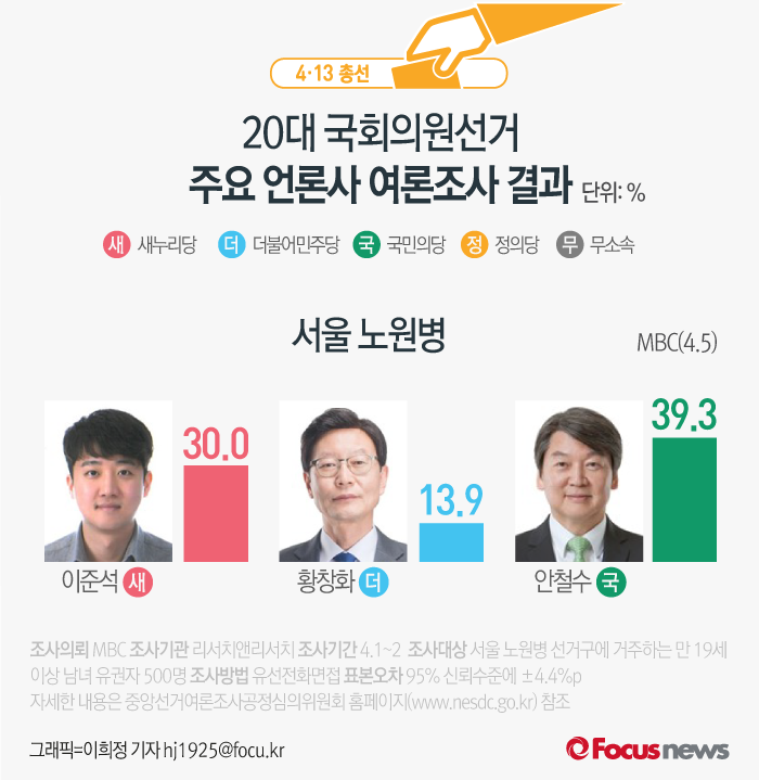 (서울=포커스뉴스) MBC가 리서치앤리서치에 의뢰해 5일 발표한 여론조사 결과에 따르면 새누리당 이준석 후보의 지지율은 30.0%, 더불어민주당 황창화 후보의 지지율은 13.9%, 국민의당 안철수 후보는 39.3%를 기록했다.
