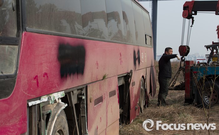 (인천=포커스뉴스) 6일 오전 인천국제공항고속도로에서 통근버스가 전복되는 사고가 발생, 한 관계자가 견인작업을 준비하고 있다.