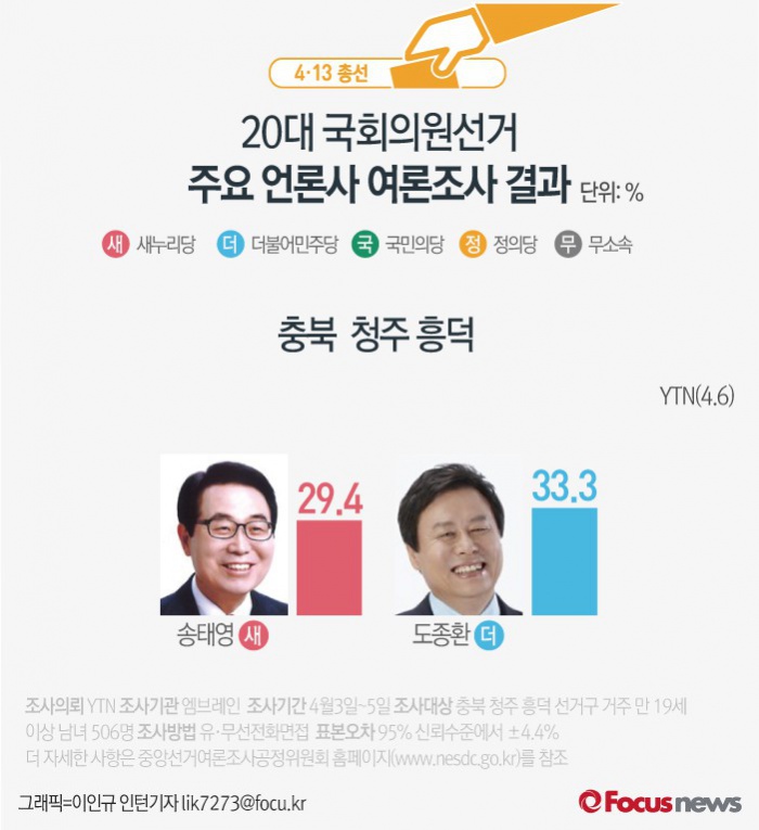 (서울=포커스뉴스) YTN이 여론조사기관 엠브레인에 의뢰해 6일 발표한 결과에 따르면 충북 청주 흥덕에서 새누리당 송태영 후보의 지지율은 29.4%, 더불어민주당 도종환 후보의 지지율은 33.3%인 것으로 나타났다.