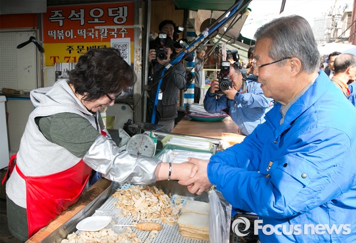 (서울=포커스뉴스) 김종인(오른쪽) 더불어민주당 비대위 대표 겸 선대위원장이 6일 오전 서울 용산구 용문시장을 방문해 상인과 인사하며 진영 용산구 후보의 지지를 호소하고 있다.