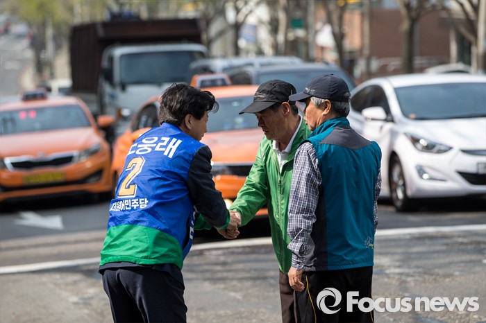 (서울=포커스뉴스) 노웅래 더불어민주당 마포구갑 후보가 6일 오전 서울 마포구 공덕동 일대에서 선거운동을 하고 있다.