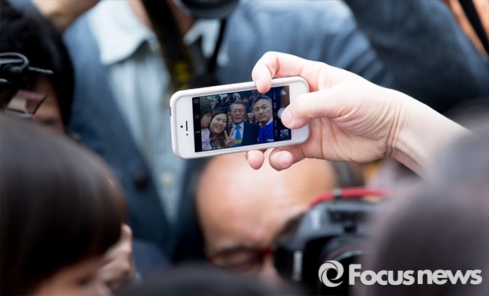 (용인=포커스뉴스) 6일 오전 경기 용인 기흥구 보정동 인근에서 문재인 더불어민주당 전 대표가 표창원 더민주 용인시정 후보 지원유세를 하고 있다.