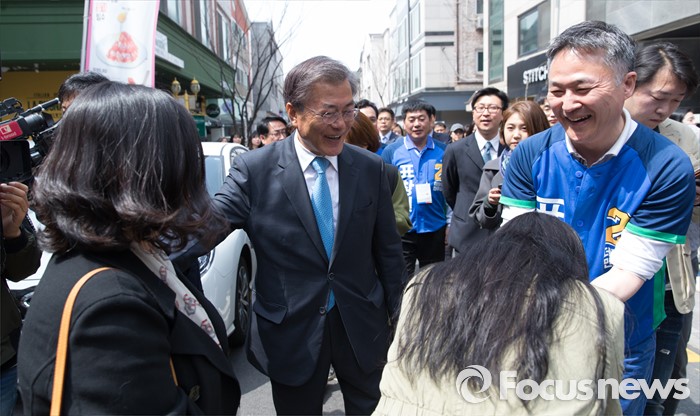 (용인=포커스뉴스) 6일 오전 경기 용인 기흥구 보정동 카페거리에서 문재인 더불어민주당 전 대표가 표창원 더민주 용인시정 후보 지원유세를 하고 있다.