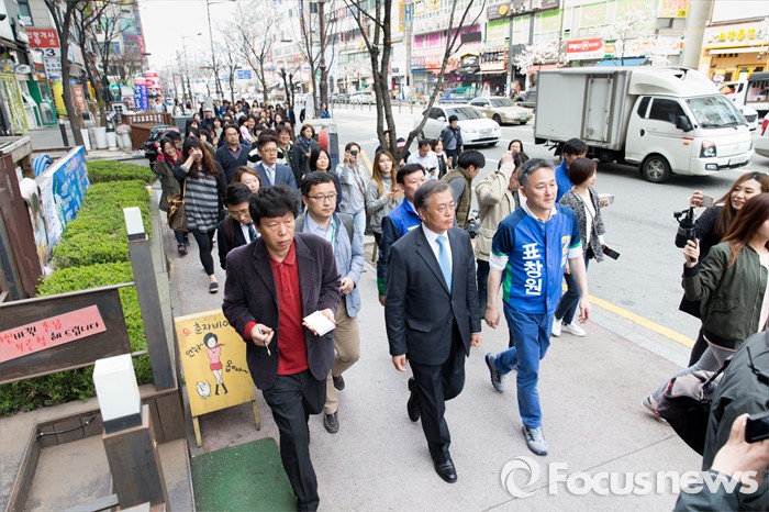 (용인=포커스뉴스) 6일 오전 경기 용인 기흥구 보정동 인근에서 문재인 더불어민주당 전 대표가 표창원 더민주 용인시정 후보 지원유세를 하고 있다.