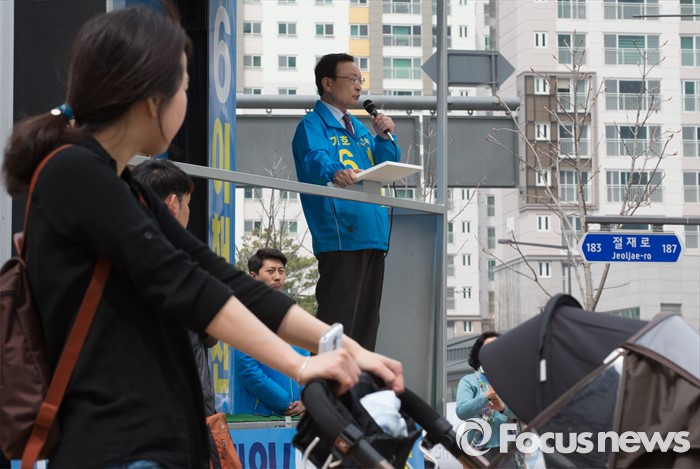 (세종=포커스뉴스) 이해찬 무소속 후보가 6일 오후 세종시 도담동 중앙타운 네거리에서 지지를 호소하고 있다.