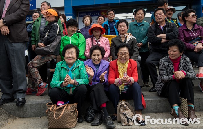(당진=포커스뉴스) 6일 오후 충남 당진 구 버스터미널 사거리에서 열린 김무성 새누리당 대표, 김동완 당진시 후보 지원유세장에서 유권자들이 김 대표의 지지연설을 듣고 있다.