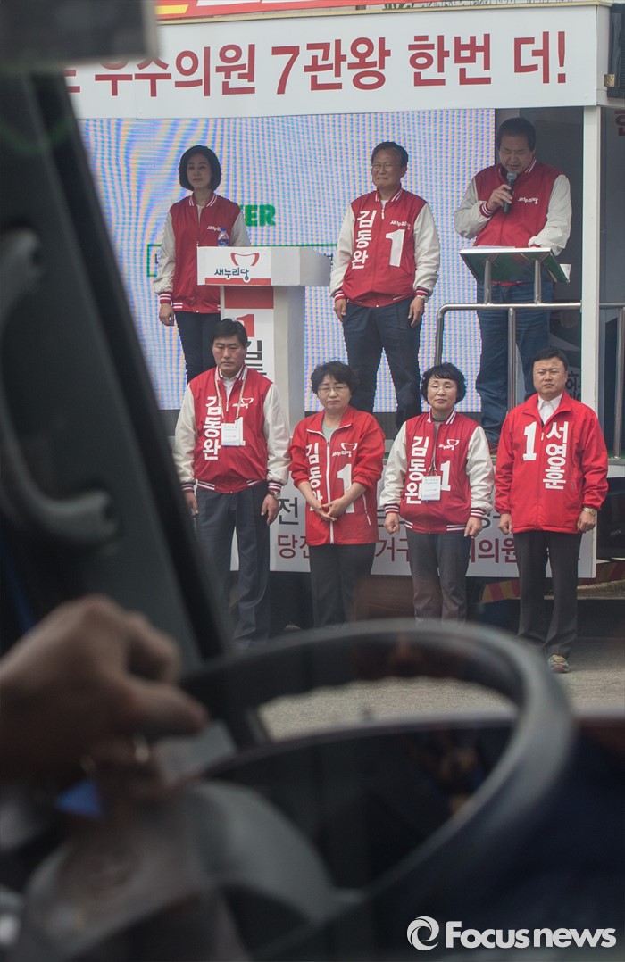 (당진=포커스뉴스) 6일 오후 충남 당진 구 버스터미널 사거리에서 김무성(오른쪽) 새누리당 대표가 김동완 당진시 후보 지원유세를 하고 있다.