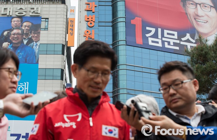 (대구=포커스뉴스) 김문수 새누리당 수성구갑 후보가 6일 오후 대구광역시 수성구 범어네거리에서 새누리당 공천 잘못과 대구 경제 못 살린것에 대해 백배 사죄의 절을 마친 후 인터뷰하고 있다.
