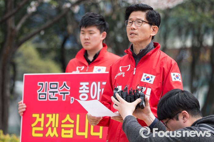 (대구=포커스뉴스) 김문수 새누리당 수성구갑 후보가 6일 오후 대구광역시 수성구 범어네거리에서 새누리당 공천 잘못과 대구 경제 못 살린것에 대해 백배 사죄의 절을 마친 후 인터뷰하고 있다.
