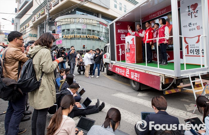 (아산=포커스뉴스) 6일 오후 충남 아산 충무로에서 이명수 새누리당 아산시갑 후보 지원유세에 나선 김무성 대표가 유권자들에게 지지를 호소하고 있다.