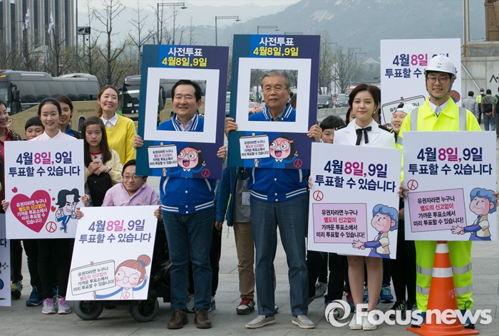 (서울=포커스뉴스) 김종인 더불어민주당 비대위 대표 겸 선대위원장이 6일 오후 서울 광화문광장에서 정세균 종로구 후보, 비례대표 후보, 창원 봉강초등학교 학생들과 20대 총선 사전투표 캠페인을 하고 있다.