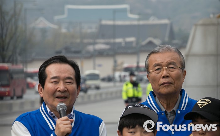 (서울=포커스뉴스) 김종인(오른쪽) 더불어민주당 비대위 대표 겸 선대위원장이 6일 오후 서울 광화문광장에서 진행된 20대 총선 사전투표 캠페인에 참석해 정세균 종로구 후보의 인사말을 듣고 있다.