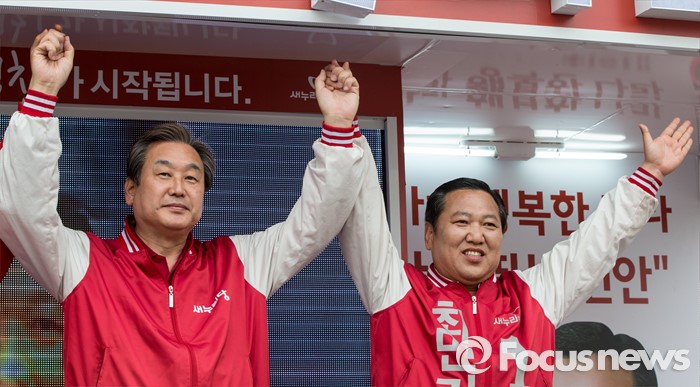 (천안=포커스뉴스) 6일 오후 충남 천안 두정로에서 최민기 새누리당 천안시을 후보 지원유세에 나선 김무성 대표가 유권자들에게 지지를 호소하고 있다.
