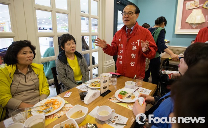 (인천=포커스뉴스) 제20대 총선에 출마한 윤형선 새누리당 계양을 후보가 6일 오후 인천 계양구 홈플러스 계산점에서 선거운동을 하고 있다.