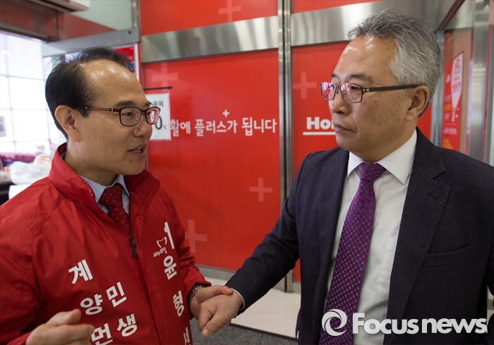 (인천=포커스뉴스) 제20대 총선에 출마한 윤형선 새누리당 계양을 후보가 6일 오후 인천 계양구 홈플러스 계산점에서 선거운동을 하고 있다.
