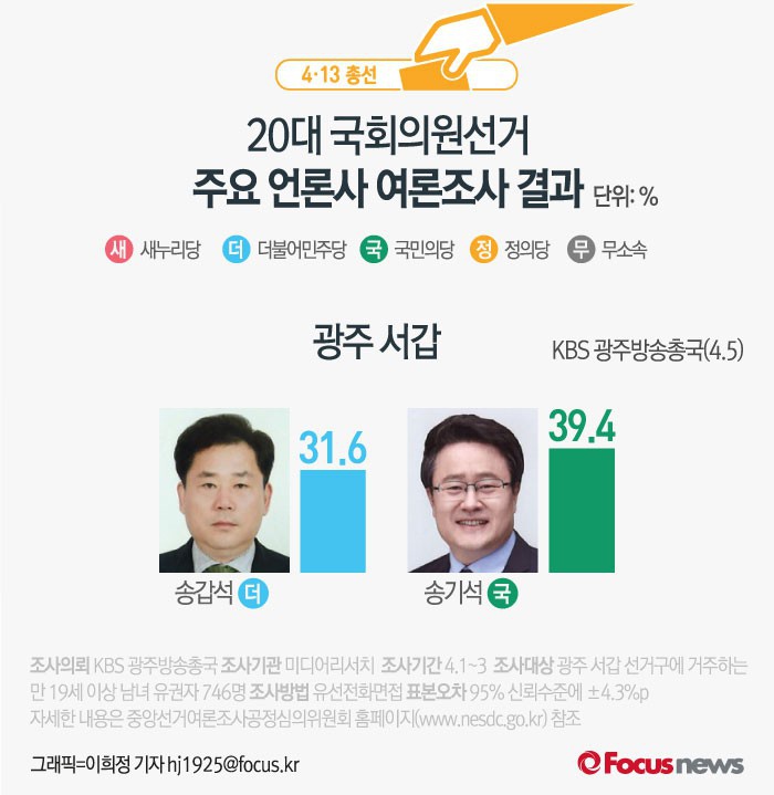 (서울=포커스뉴스) KBS 광주방송총국이 미디어리서치에 의뢰해 5일 발표한 광주 서갑 여론조사 결과에 따르면 더불어민주당 송갑석 후보의 지지율은 31.6%, 국민의당 송기석 후보는 39.4%를 기록했다.