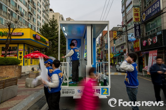 (서울=포커스뉴스) 안규백 더불어민주당 동대문구갑 후보가 6일 오후 서울 동대문구 휘경동 일대에서 유권자들에게 소중한 한 표를 호소 하고 있다.