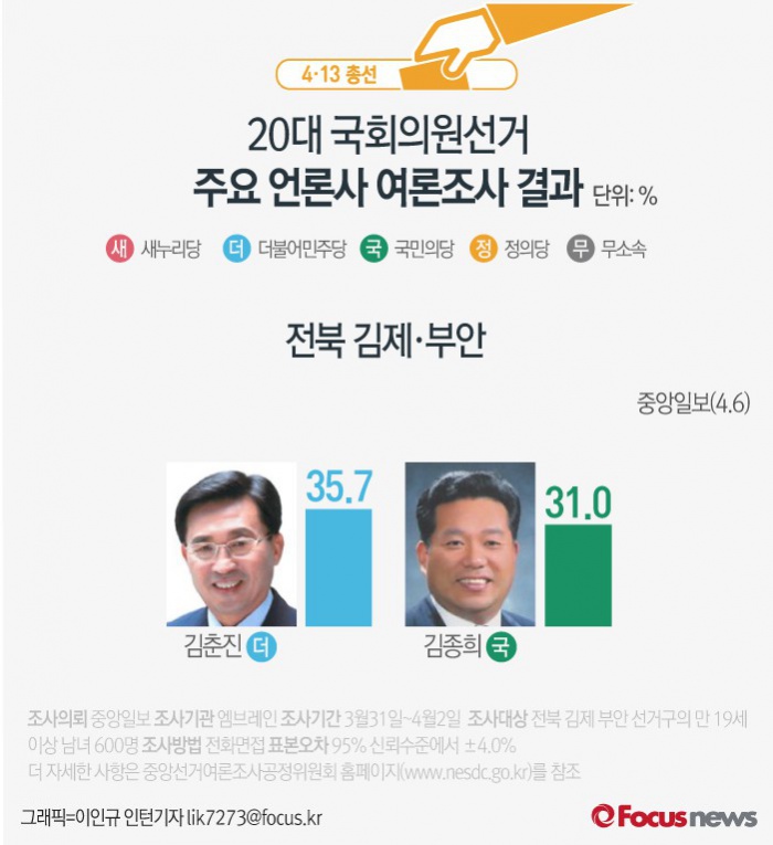 (서울=포커스뉴스) 중앙일보가 여론조사기관 엠브레인에 의뢰해 6일 발표한 결과에 따르면 전북 김제 부안에서 더불어민주당 김춘진 후보의 지지율은 35.7%, 국민의당 김종희 후보 지지율은 31.0%인 것으로 나타났다.