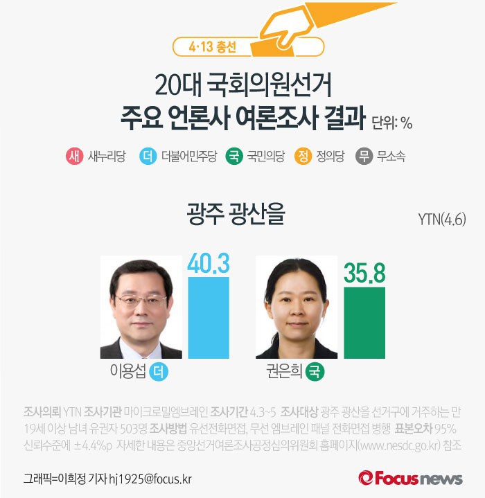 (서울=포커스뉴스) YTN이 마이크로밀엠브레인에 의뢰해 6일 발표한 광주 광산을 여론조사 결과에 따르면 더불어민주당 이용섭 후보의 지지율은 40.3%, 국민의당 권은희 후보는 35.8%를 기록했다.