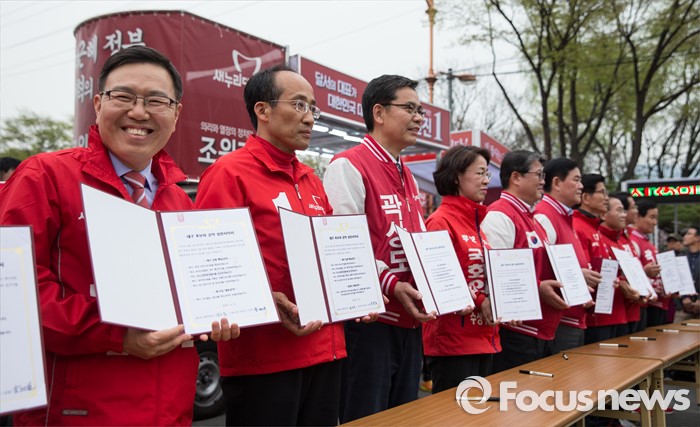 (대구=포커스뉴스) 새누리당 대구지역 후보자들이 6일 오후 대구광역시 달서구 성당동에서 열린 대구지역 후보자 총집결 거리유세에서 '대구 후보자 공약 실천 서약서'에 사인을 마친 후 서약서를 들어 보이고 있다.