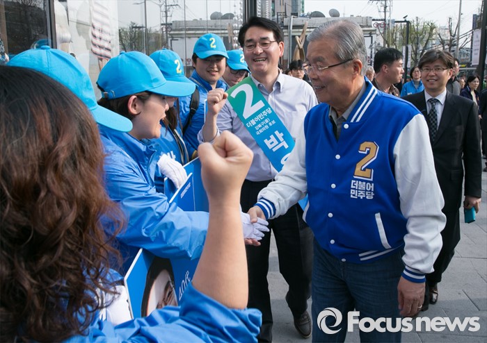 (서울=포커스뉴스) 6일 오후 서울 롯데백화점 미아점 앞에서 김종인(오른쪽) 더불어민주당 비대위 대표 겸 선대위원장이 박용진(가운데) 강북을 후보의 선거운동원들을 격려하고 있다.