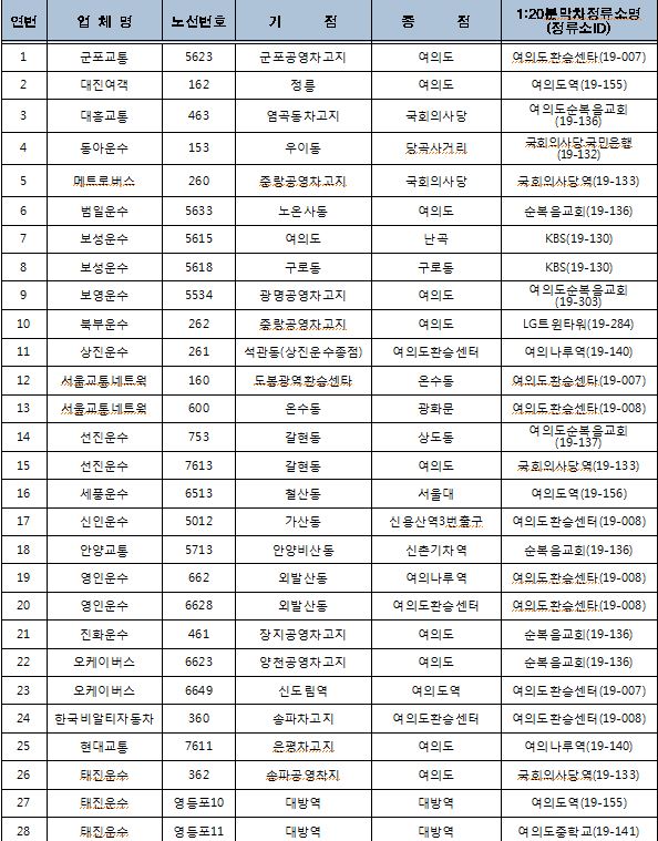운행이 연장되는 시내버스는 총 28개 노선으로 △여의서로 인근 △여의도환승센터 △국회의사당역 △순복음교회 정류소 등에서 오전 1시 20분에 차고지를 향해 출발한다.
