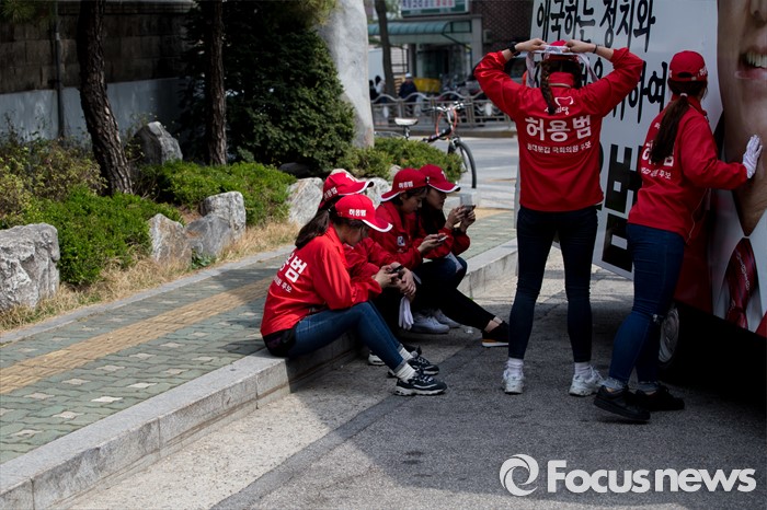 (서울=포커스뉴스) 6일 오후 서울 동대문구 제기동 일대에서 주민들이 태극기를 들고 허용범 새누리당 동대문구갑 후보의 선거운동원들이 선거운동을 마친 뒤 햇볕을 피해 휴식 하고 있다.