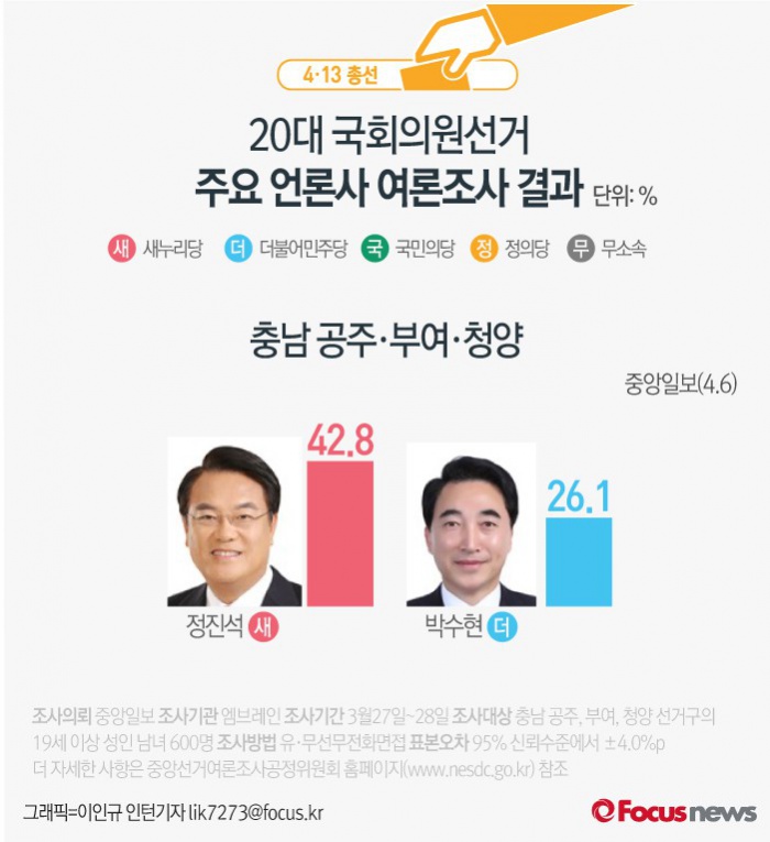 (서울=포커스뉴스) 중앙일보가 여론조사기관 엠브레인에 의뢰해 6일 발표한 결과에 따르면 충남 공주 부여 청양에서 새누리당 정진석 후보의 지지율은 42.8%, 더불어민주당 박수현 후보의 지지율은 26.1%인 것으로 나타났다.