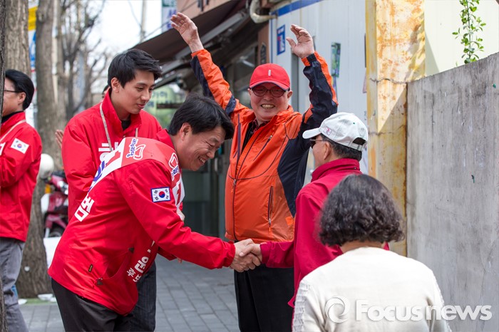 (서울=포커스뉴스) 허용범 새누리당 동대문구갑 후보가 6일 오후 서울 동대문구 제기동 일대에서 유세에 앞서 유권자들과 인사를 나누고 있다.