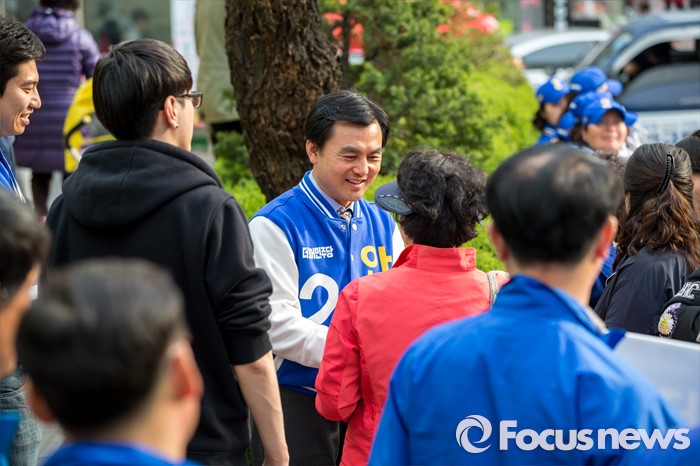 (서울=포커스뉴스) 안규백 더불어민주당 동대문구갑 후보가 6일 오후 서울 동대문구 휘경동 일대에서 유세에 앞서 유권자들에게 인사 하고 있다.