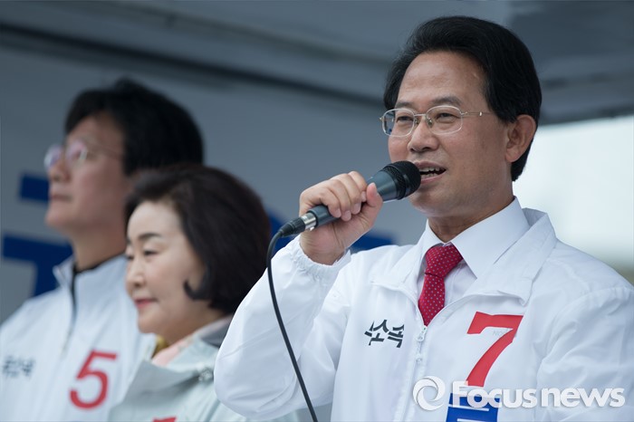 (대구=포커스뉴스) 류성걸 무소속 동구갑 후보가 6일 오후 대구광역시 북구 칠성시장 앞에서 유승민, 권은희 후보와 함께 선거 유세를 하고 있다.
