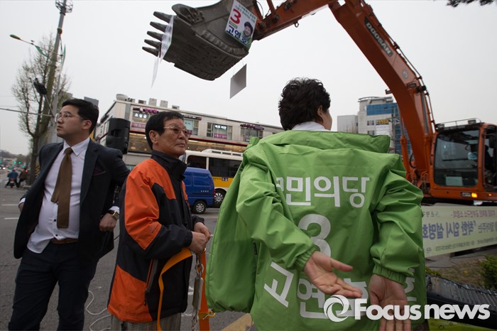 (서울=포커스뉴스) 6일 오후 서울 은평구 연신내 물빛공원에서 고연호 국민의당 은평구을 후보가 포클레인에 오르기위해 안전띠를 착용하고 있다.