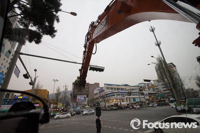 (서울=포커스뉴스) 6일 오후 서울 은평구 연신내 물빛공원에서 고연호 국민의당 은평구을 후보가 포클레인 위에서 유세를 하고 있다.