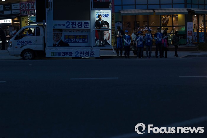 (서울=포커스뉴스) 20대 총선을 일주일 앞둔 6일 오후 서울 강서구 신방화역 인근에서 진성준 더불어민주당 강서구을 후보가 퇴근길 유세를 하고 있다.