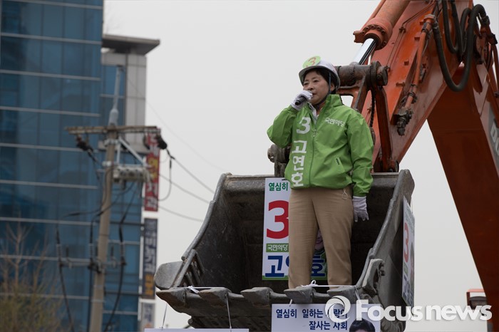 (서울=포커스뉴스) 6일 오후 서울 은평구 연신내 물빛공원에서 고연호 국민의당 은평구을 후보가 포클레인 위에서 유세를 하고 있다.