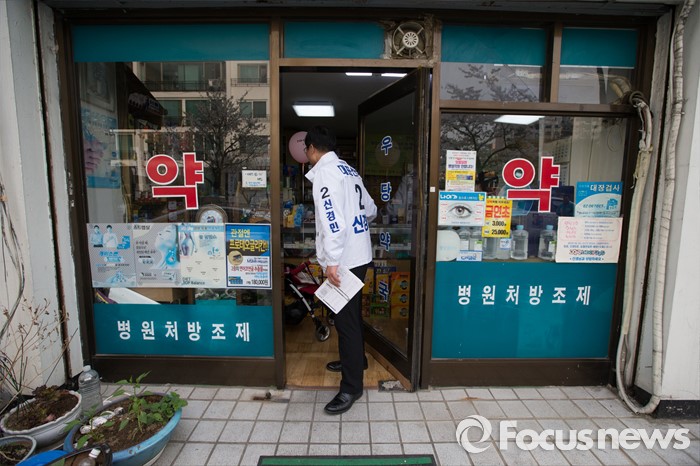 (서울=포커스뉴스) 6일 오후 서울 영등포구 한양아파트 사거리 일대에서 신경민 더불어민주당 영등포구을 후보자가 유세를 하고 있다.