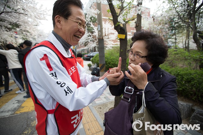 (서울=포커스뉴스) 6일 오후 서울 영등포구 대림1동 일대에서 권영세 새누리당 영등포구을 후보자가 유세를 하고 있다.