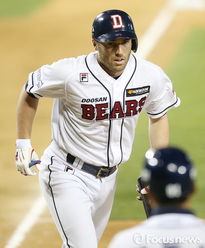 (서울=포커스뉴스) 6일 서울 잠실구장에서 열린 2016 프로야구 NC-두산 경기 6회말 1사후 두산 에반스가 우월 1점 홈런을 치고 홈인하고 있다.
