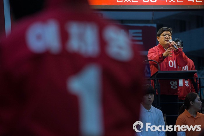 (서울=포커스뉴스) 6일 오후 서울 강동구 천호동 인근의 한 아파트 앞에서 이재영 새누리당 후보가 유세를 펼치고 있다.