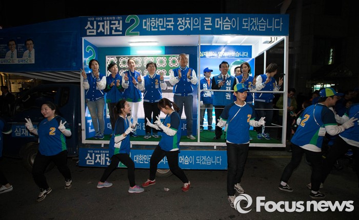 (서울=포커스뉴스) 6일 오후 서울 강동구 이마트 앞에서 김종인 더불어민주당 비대위 대표가 심재권 후보와 함께 유세를 펼치고 있다.