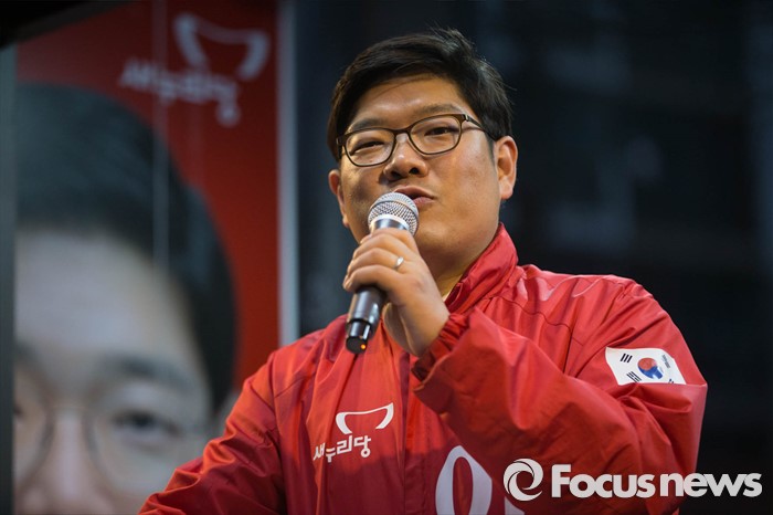 (서울=포커스뉴스) 6일 오후 서울 강동구 천호동 인근의 한 아파트 앞에서 이재영 새누리당 후보가 유세를 펼치고 있다.