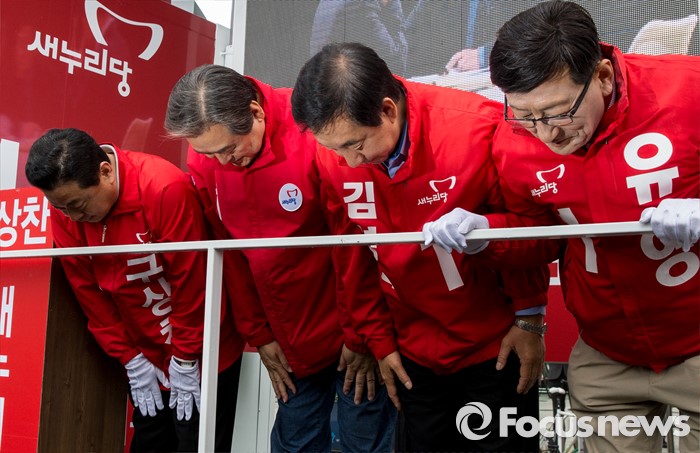 (서울=포커스뉴스) 7일 오전 서울 강서구 화곡역 사거리에서 강서구갑ㆍ을ㆍ병 후보 합동 지원유세에 나선 김무성(왼쪽 두번째) 새누리당 대표가 후보들과 함께 유권자들에게 고개 숙여 인사하고 있다.