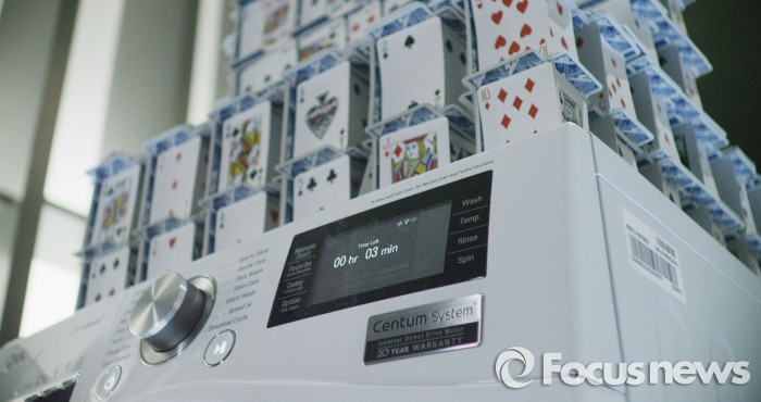 LG전자와 브라이언 버그는 12시간 동안 3.3m 높이의 카드탑을 쌓아 세계기록을 수립했다. 평지가 아닌 진동이 계속되고 있는 세탁기 위에서 성공한 것이다.