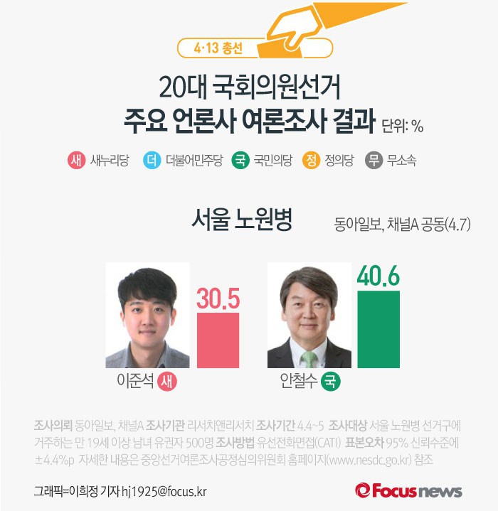(서울=포커스뉴스) 동아일보와 채널A가 리서치앤리서치에 의뢰해 7일 발표한 서울 노원병 여론조사 결과에 따르면 새누리당 이준석 후보의 지지율은 30.5%, 국민의당 안철수 후보는 40.6%를 기록했다.