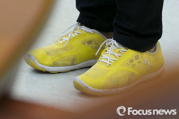 (서울=포커스뉴스) 심상정 정의당 대표가 7일 오전 서울 여의도 국회에서 노란 운동화를 신고 총선전략 기자회견을 하고 있다.